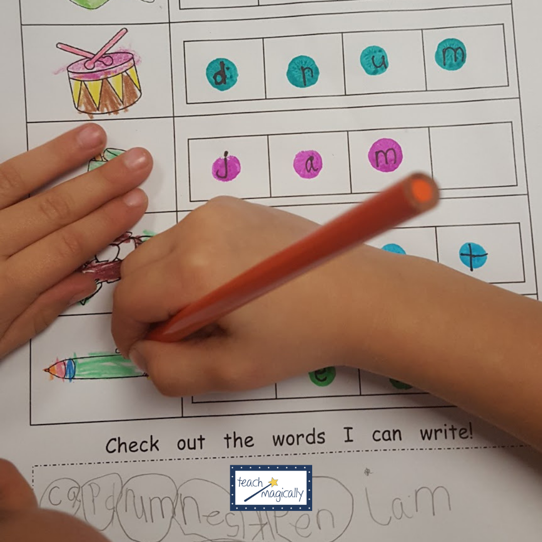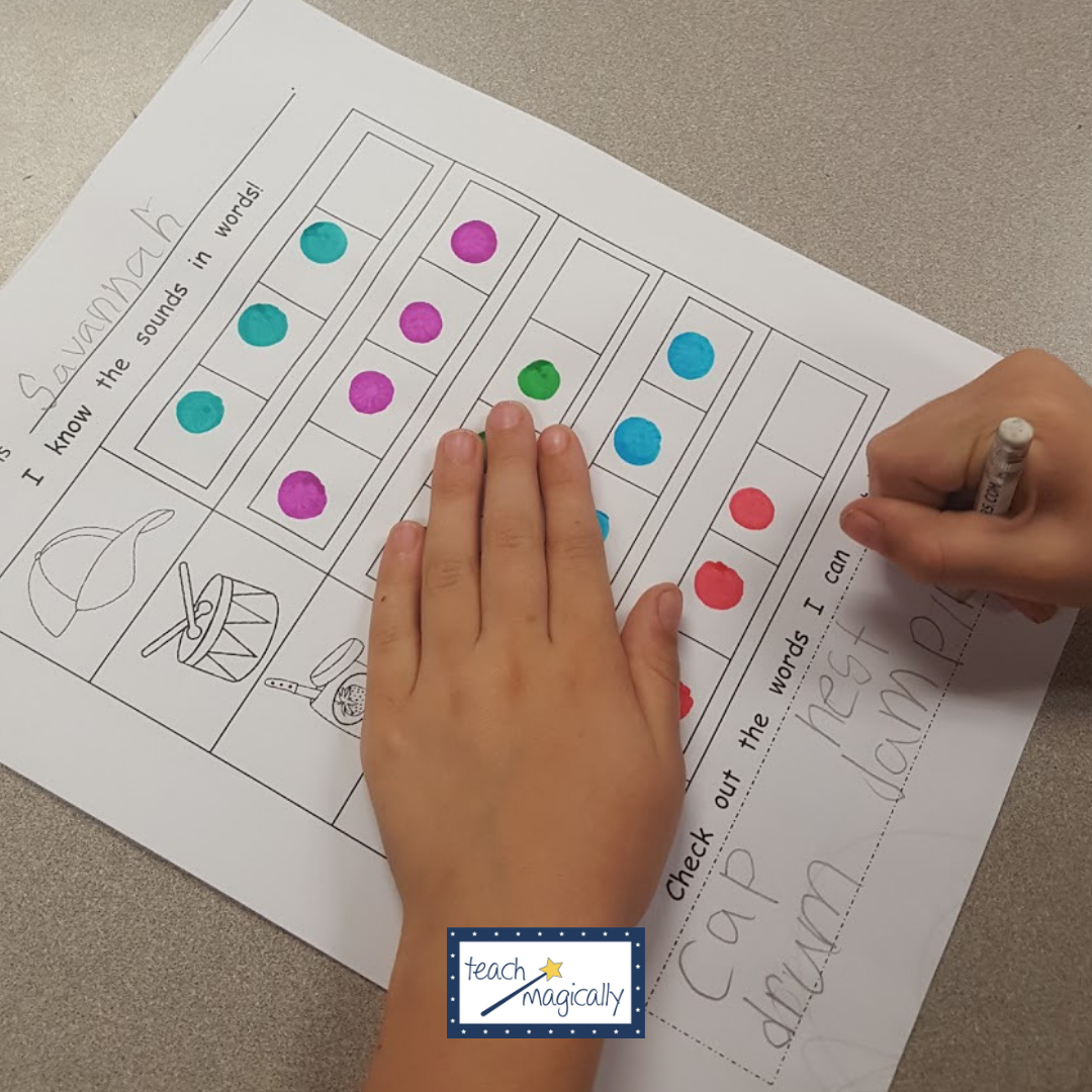 For example, I like to use these No Prep Sound (phoneme) Worksheets with BINGO dabbers. Students touch one square for each sound! After that, students write letters for the sounds over the top of the dots or the word at the bottom.
