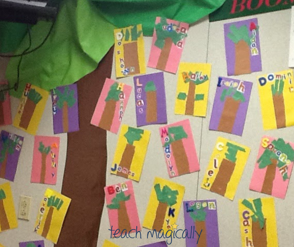 After reading Chicka Chicka Boom Boom and watching the video (yep…still on YouTube) we created our own torn paper coconut trees then added our names with cut out letters. Yep, getting that name work in there!