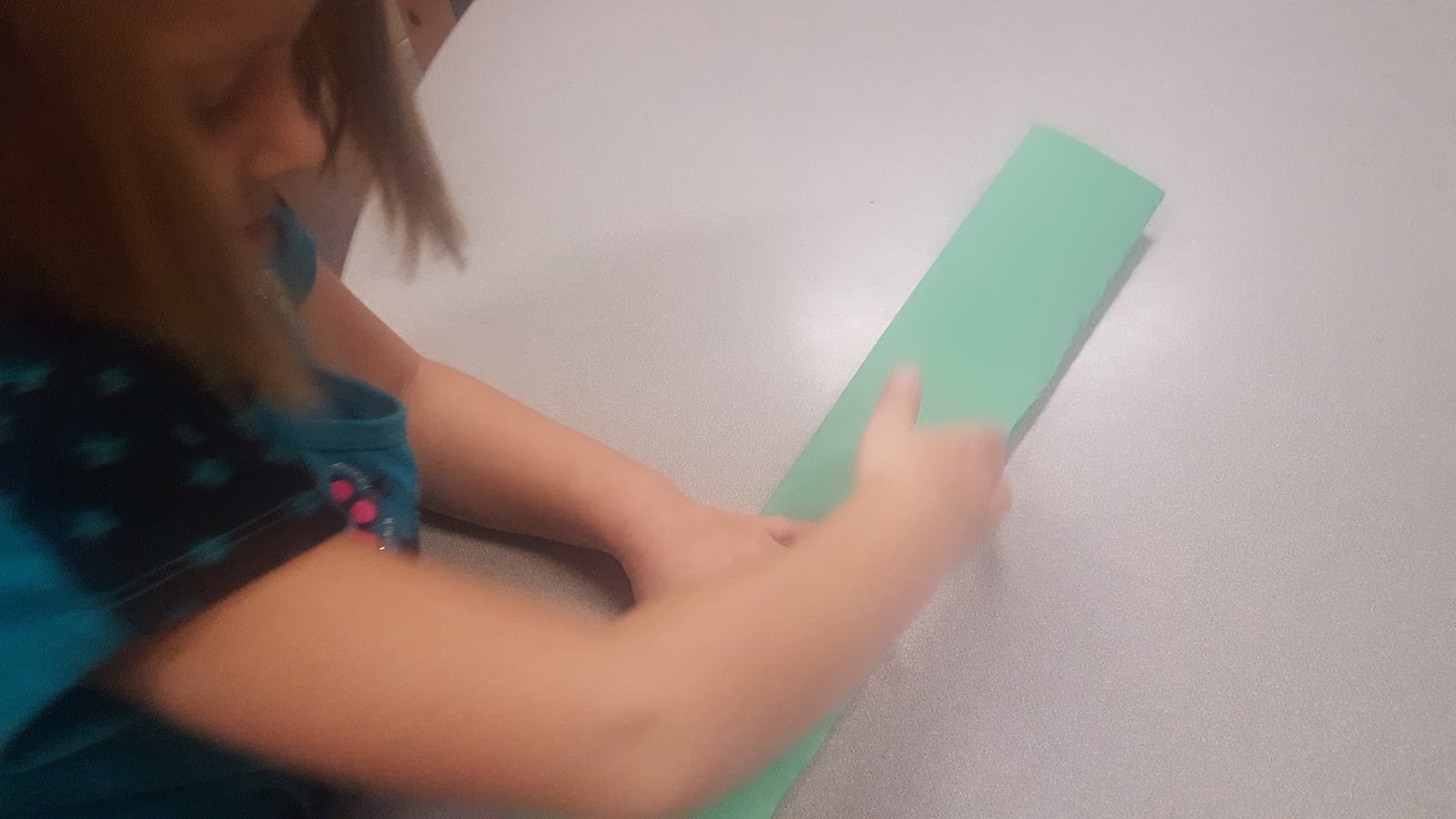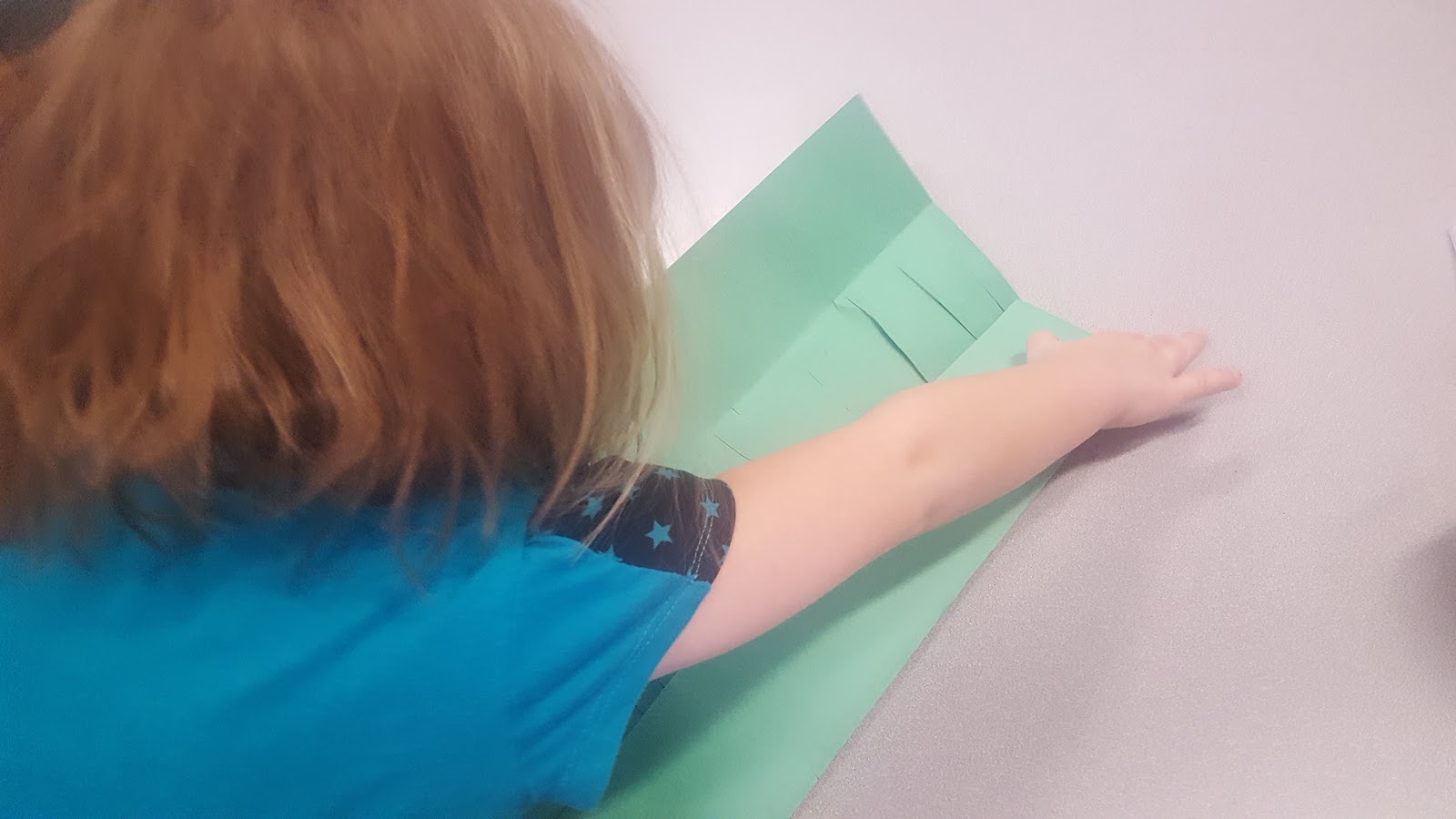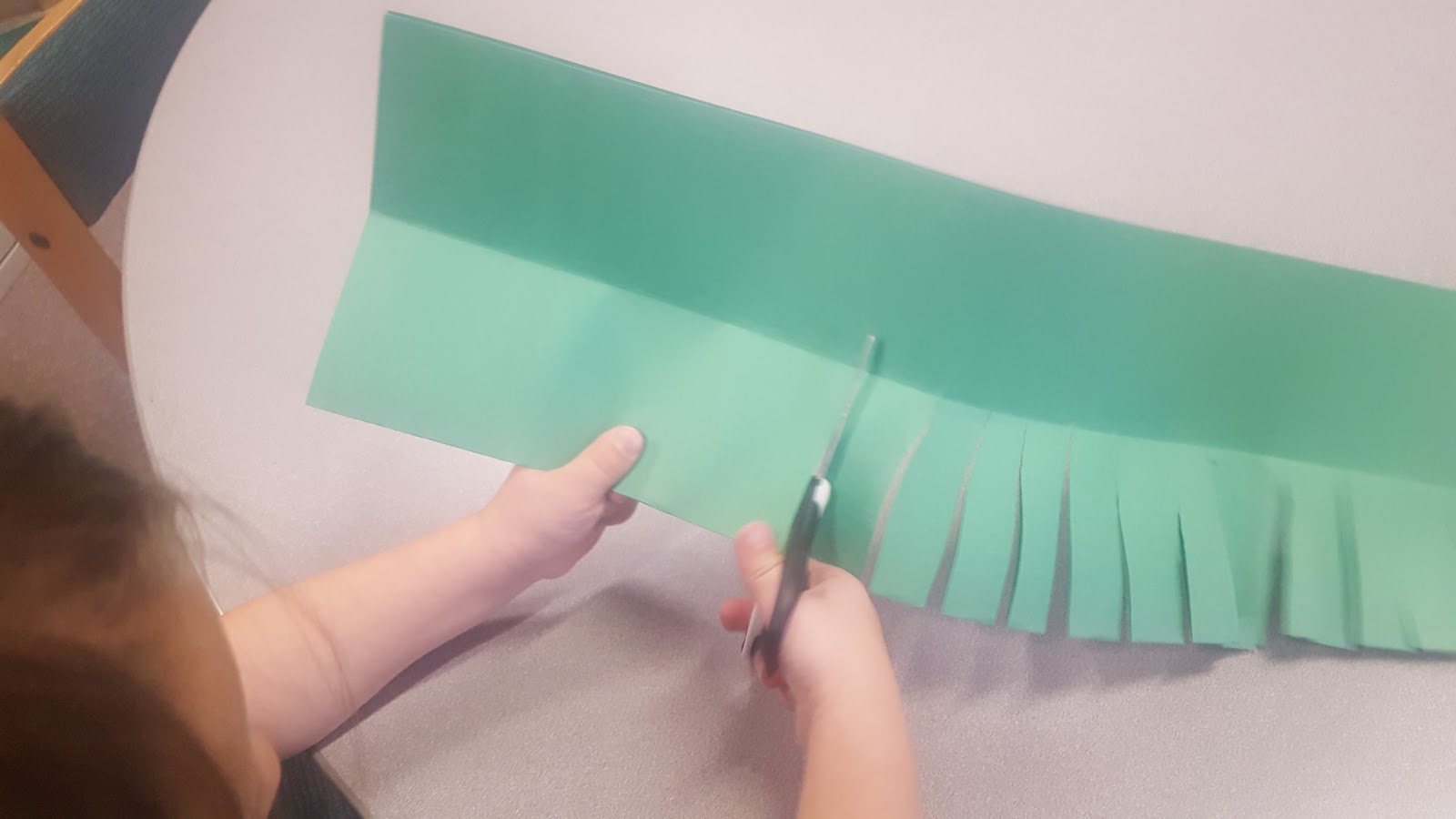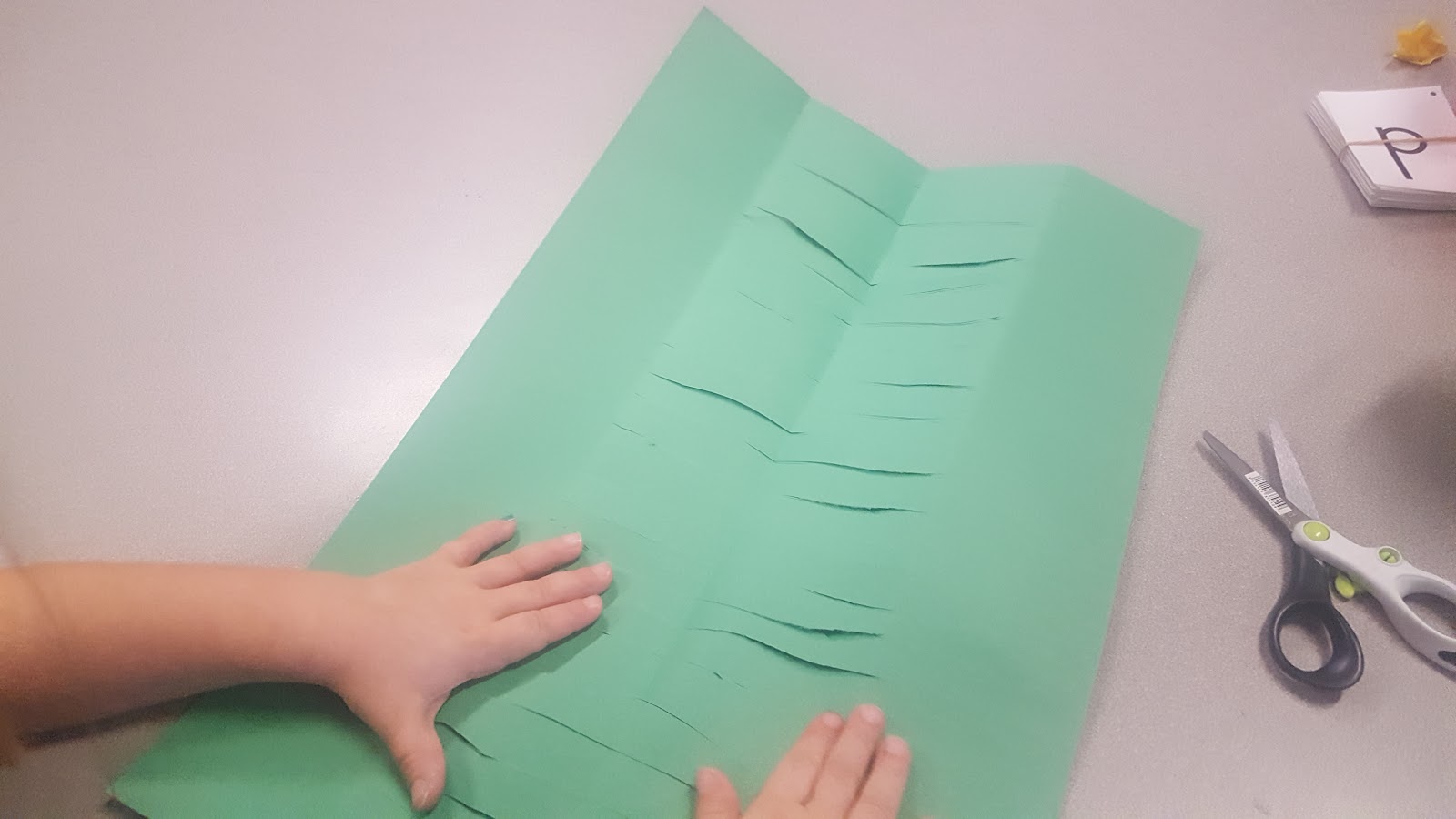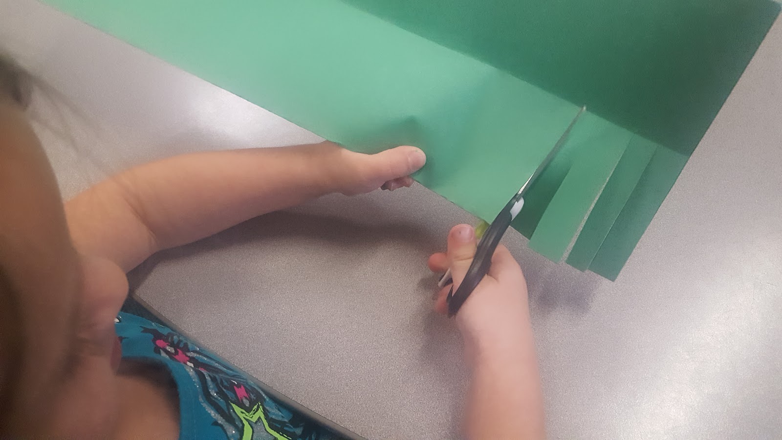4th– Next, cut straight lines, evenly from the folded paper edge to the folded middle line. Be sure to cut right to the middle line! “Touch the middle line!” is what I always say to help the kiddos.5th– Keep cutting equal size lines! Be sure to emphasize thumb up, elbow in!