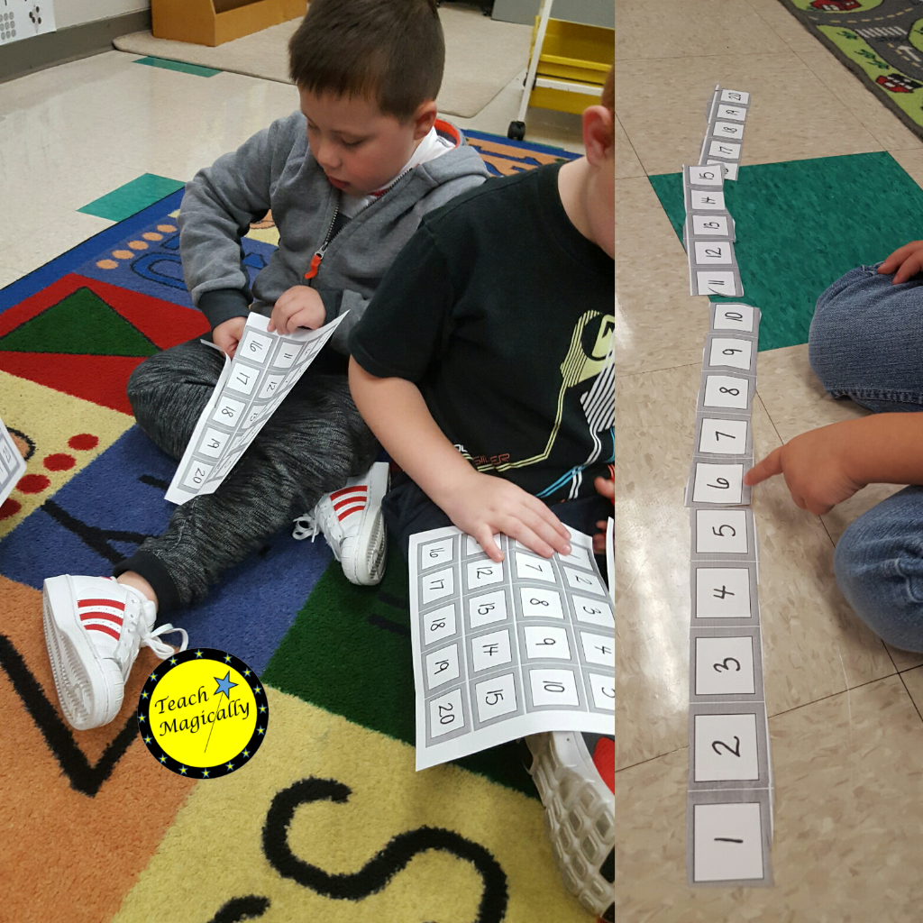 One of my favorite is Search the Room. I hide small cards around the room. The students walk around with a recording sheet to find matches. The students must count the dots, color the match, and then search for a new match. It is amazing to see the students that need to count the same number of dots over and over ( I can also quickly assess one to one counting)…then the ones that begin to add independently.