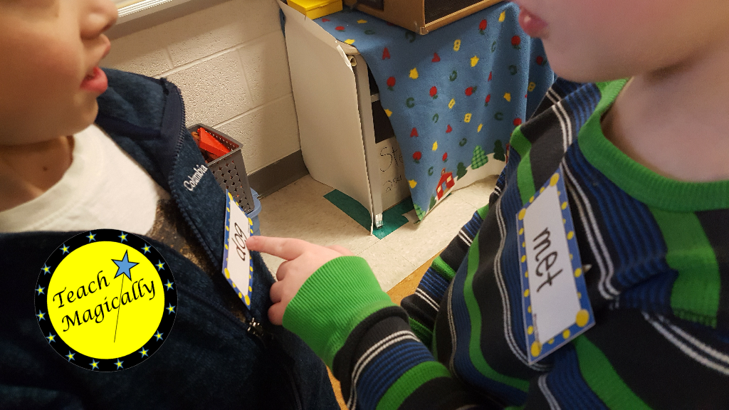 The partner team has to take turns reading the other friends shirt! Sometimes friends have to help each other! For this game, the kiddos keep the same word so they are helping their friends practice plus it builds confidence because that will be one word that will hopefully stay in the kiddos long term memories.