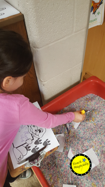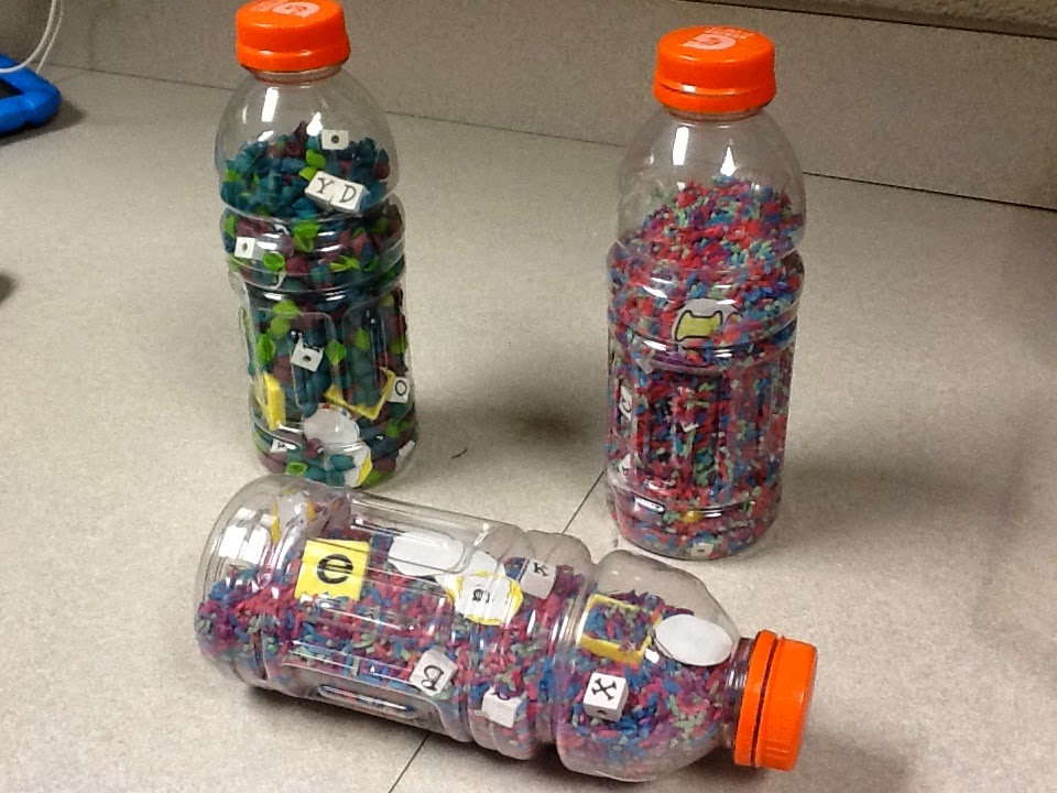 The students used them to find letters. Always, add the colored rice you created with any letters you can find. I used small copied letters, beads, and letter tiles all in random order.